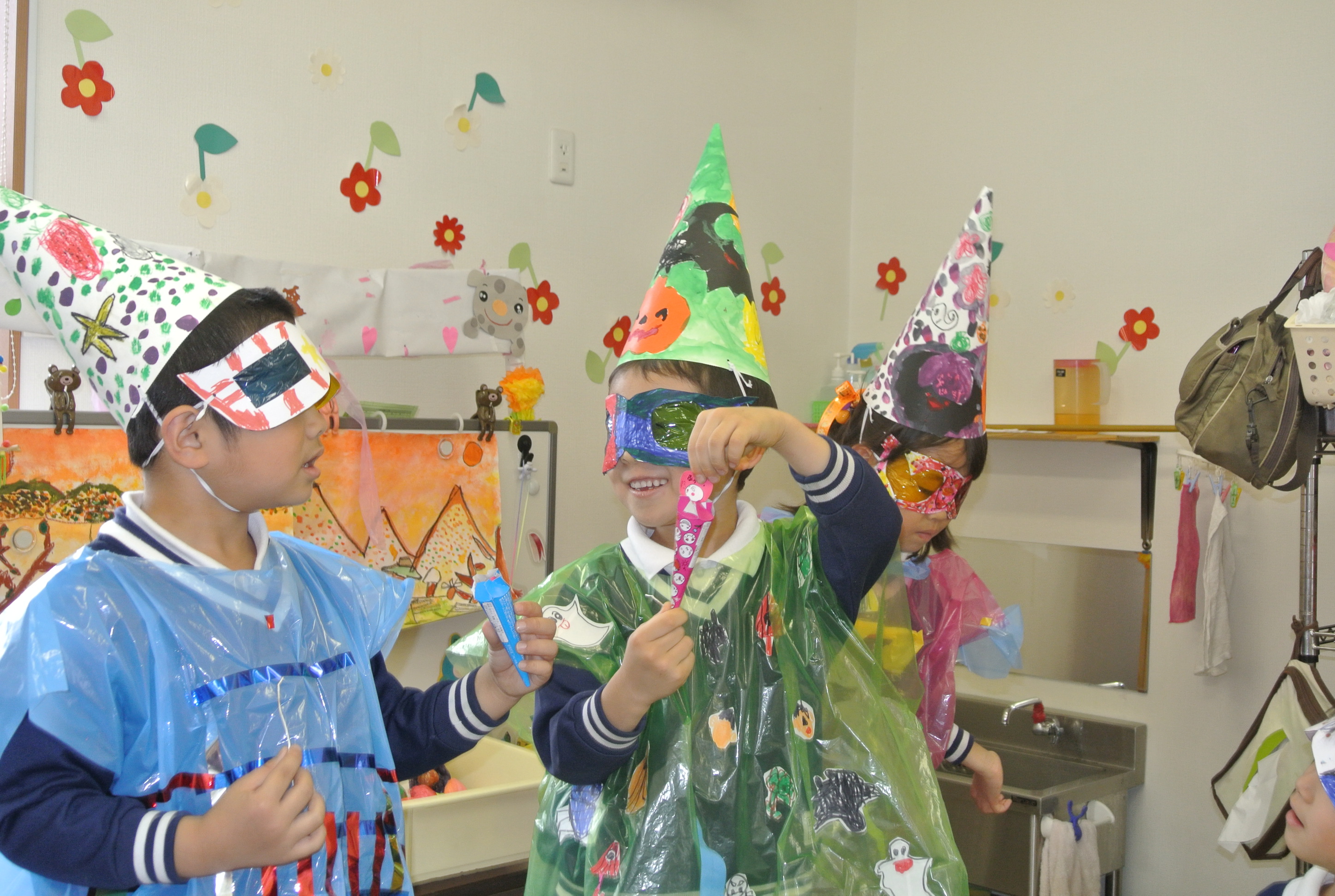 例年よりも早い木枯らし1号の便りと共に、秋の深まりを日一日と感じる季節になりました。毎日、葉っぱが色づくのが楽しみです。さて先週のやんちゃか村は、運動会で勢いづいたゲーム戦の延長で、風船バレーボールやはボール運び競争など戸外で毎日元気に過ごしました。また、年々仮装度が増すハロウィンパーティー。帽子やサングラスを作って楽しみました。恒例のなったハロウィンポット探しでも、盛り上がりました。・・写真 玄関先に干し柿を吊るしました。渋柿?・甘柿?・普通の柿?何がちがうのかなぁと首をかしげている子ども達です。連日りんご・なし・柿の食べ放題!秋の味覚を楽しんでいます。