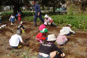 10月22日(水) 晴天 鳩ケ谷市辻にて 今日は、お芋掘り遠足に出かけてきました。事前にさつまいもを見せたり、図鑑でお芋掘り畑を調べたりしたものの初めての子ども達は虫やドロ(土です)フリーズ状態。去年経験した子供達は、ひとつでも多く採ろうと大張りきり。個性豊かな子どもたちです。今日は、お母様にどんなお芋のお料理を作っていただくのでしょう。明日の子供たちのお話が楽しみです。