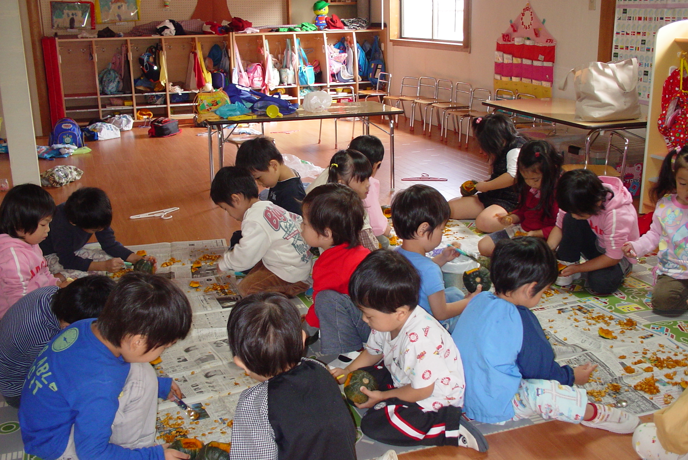 今日は、恒例となっているハロウィンのかぼちゃづくりをしました。 いつもは、「おばけ」は絵本の中のお話だけにしているやんちゃかですが、今日はみんなのお家に来ないように本当のかぼちゃを使ってかぼちゃおぼけをつくりました。固いかぼちゃをスプーンで一生懸命中身をくりぬきました。みんなのお家に遊びにきた「おばけ」を脅かそうと玄関に飾るそうです。