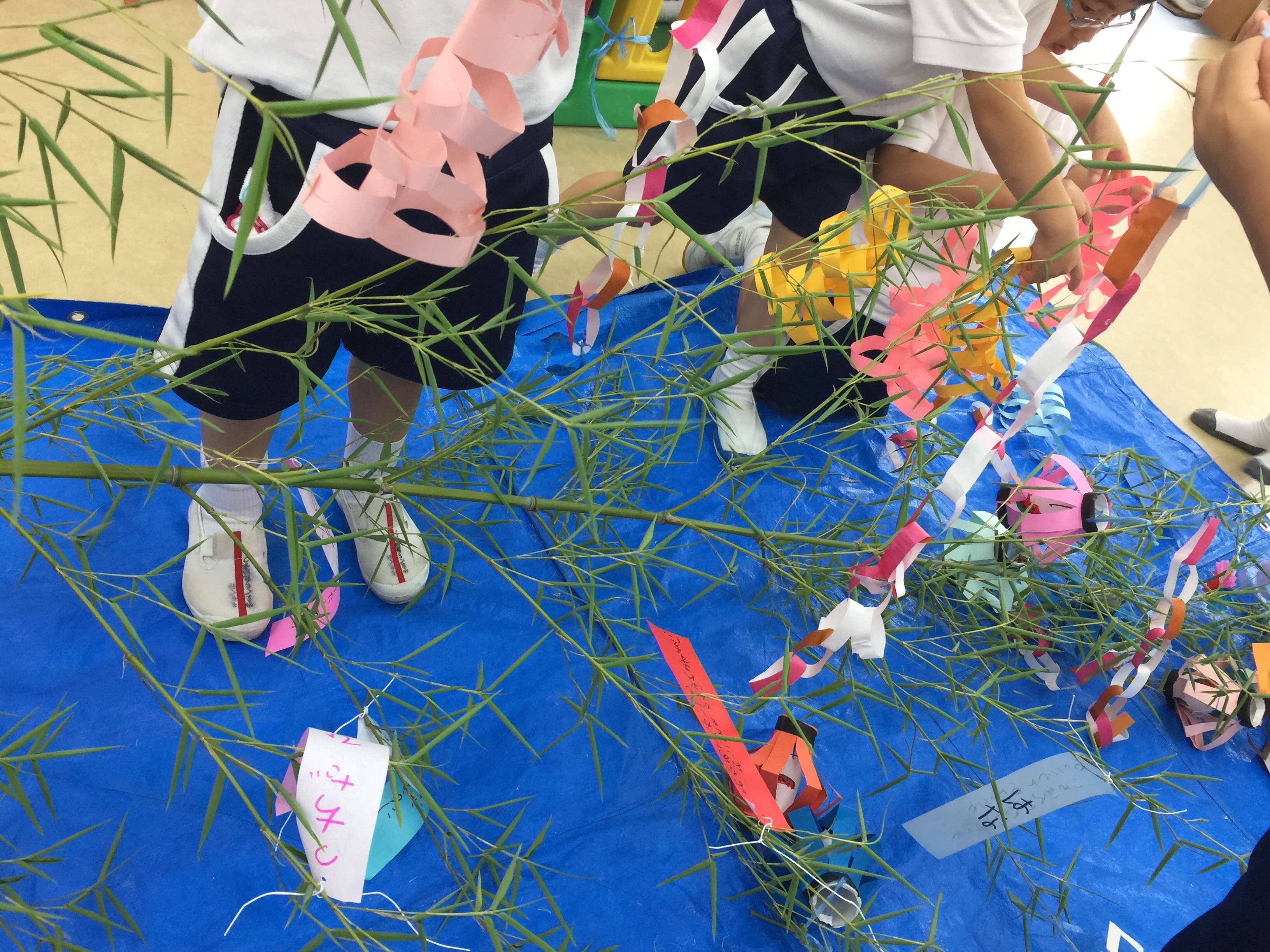 毎日コツコツ、ハサミのお稽古やおのりのお仕事の練習を兼ねて行ってきた七夕の飾り作り…早めに飾りつけをして、みんなの願いを込めた笹をお庭に飾りました。作りながら、飾りながら、自然と♫七夕さまの歌を口ずさむ子ども達。今年は晴れたので、ご家庭でお空を見上げ、天の川を探してお歌を歌ったようです^_^みんなの願い事が届きますように…連日の暑さで夏本番を感じさせる毎日!子ども達が育てている夏野菜も、美味しい色に染まり収穫を楽しんでいます。