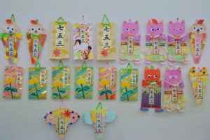 立冬を過ぎ、大急ぎで冬が近づいてきたようです。やんちゃかの子ども達は、この冷たい風に慣れるまで少しお外はお休みして、七五三さんにちなみ千歳飴袋の制作活動に取り組んでいました。障子紙にポンポン色付けをしたり、ブラッシングでぼかし絵をしたり・・普段使わない教材を使い、毎日コツコツと仕上げていきましたよ。「ぼく、もう七五三のお祝いしたよ!」と5つの男の子達は、ちょっぴりお兄さんぶってお話をしています。