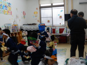 今年は、明治以来2月2日の節分となりましたねっ。やんちゃかっ子達も、毎年楽しみにしている節分の会を行いました。お豆による誤飲や窒息の危険が心配される昨今ですが、節分の由来やオニが出てくるお話しを考えながら・・きっといい子にしてくれる為にオニさんが来てくれるんだねっとみんなで話し合い豆まきを楽しみましたよ。大暴れのオニさんではなく、恥ずかしがり屋のオニは、こっそり逃げて行ってしまい、大きい組は物足りなそうでしたが・・・